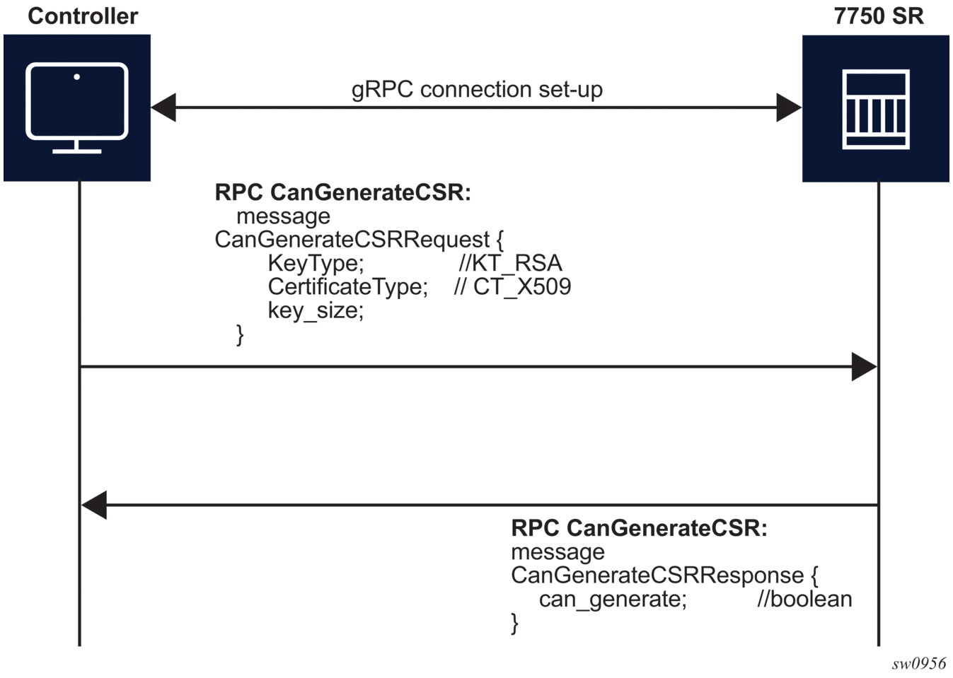 The RPC CanGenerateCSR message can be used to determine if the gRPC server (SR OS node) can generate a Certificate Signing Request (CSR). It is a simple request and response operation as shown in Figure 27.