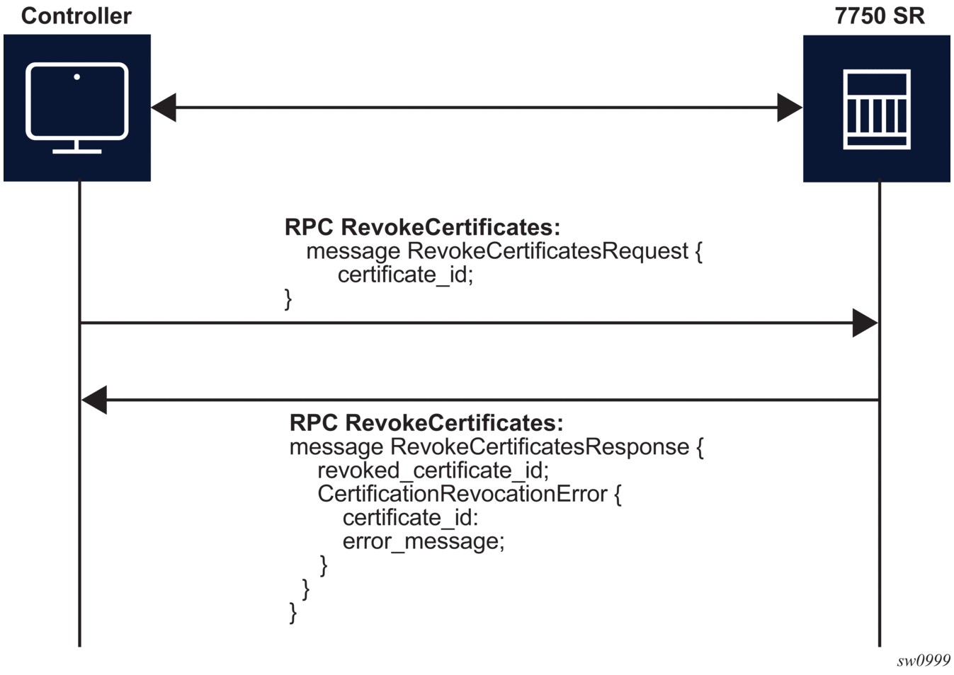 The purpose of the RPC RevokeCertificates is to render the existing certificate unusable by any client. In cases where the certificate being revoked by the client does not exist on the SR OS node, the corresponding RPC silently succeeds. The message flow is shown in Figure 34.