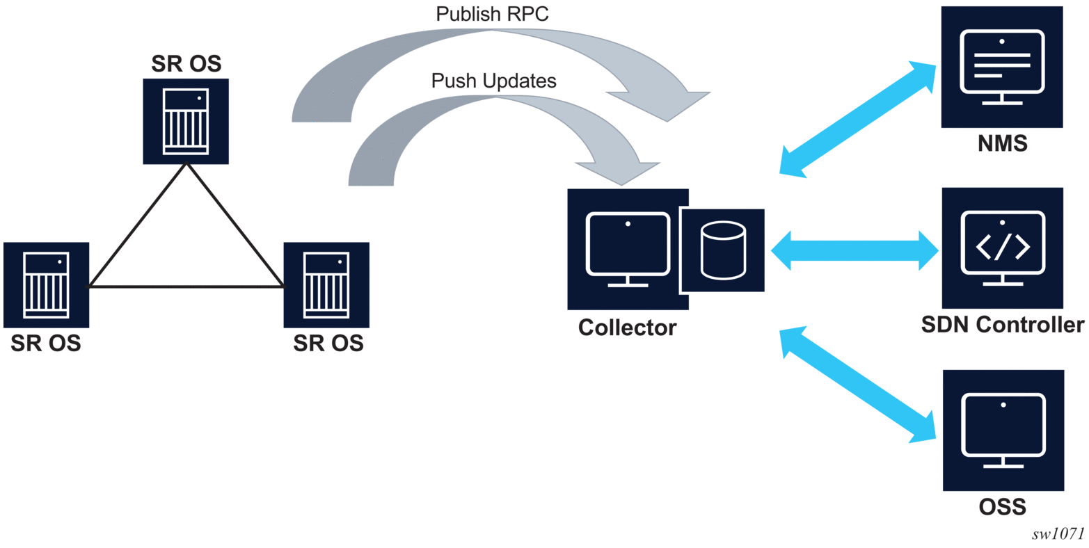 When the SR OS node initiates the gRPC connection, the SR OS node assumes the role of the gRPC client. This is referred to as dial-out telemetry. Figure 24 shows the telemetry session initiated from the SR OS node to the collector via a Publish RPC.