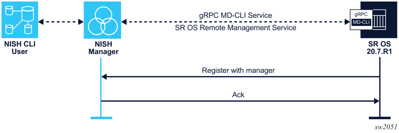 The remote management service does not perform or enable the actual management of the SR OS node using NISH. This communication is achieved directly from the NISH client to the SR OS node using the MD-CLI gRPC service.