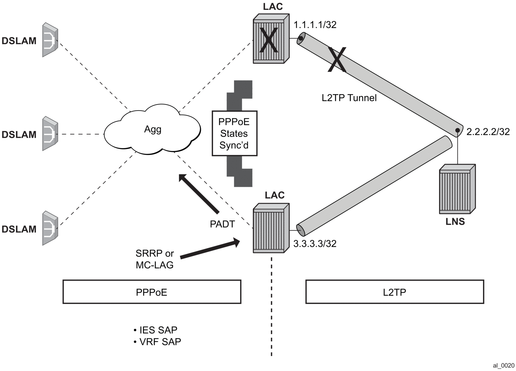 In dual-homed PPPoEv4/v6 wholesale/retail environment over L2TP, the subscriber-hosts are synchronized by the Multi-Chassis Synchronization (MCS) protocol. The failover detection mechanism can be implemented by SRRP or Layer 3 MC-LAG with SRRP. When an interface or an entire node fails, the newly selected Master sends PADT to all sessions that were moved over from the failed node.