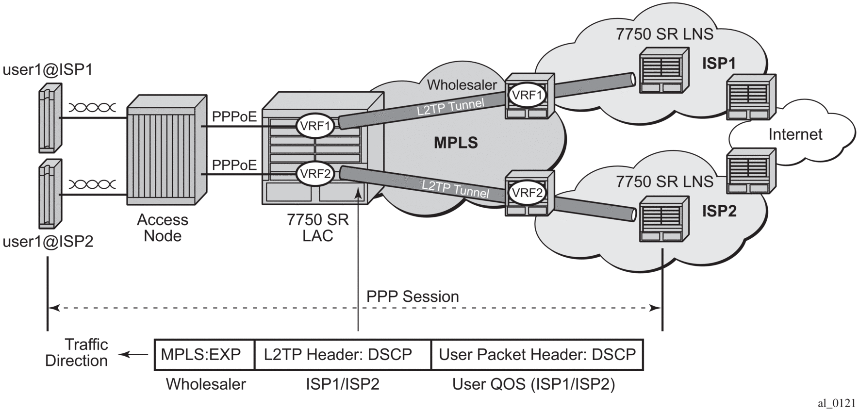 The network ingress on the LAC would normally use the MPLS EXP bits for traffic QoS classification, however, this matches the wholesale provider’s QoS scheme.