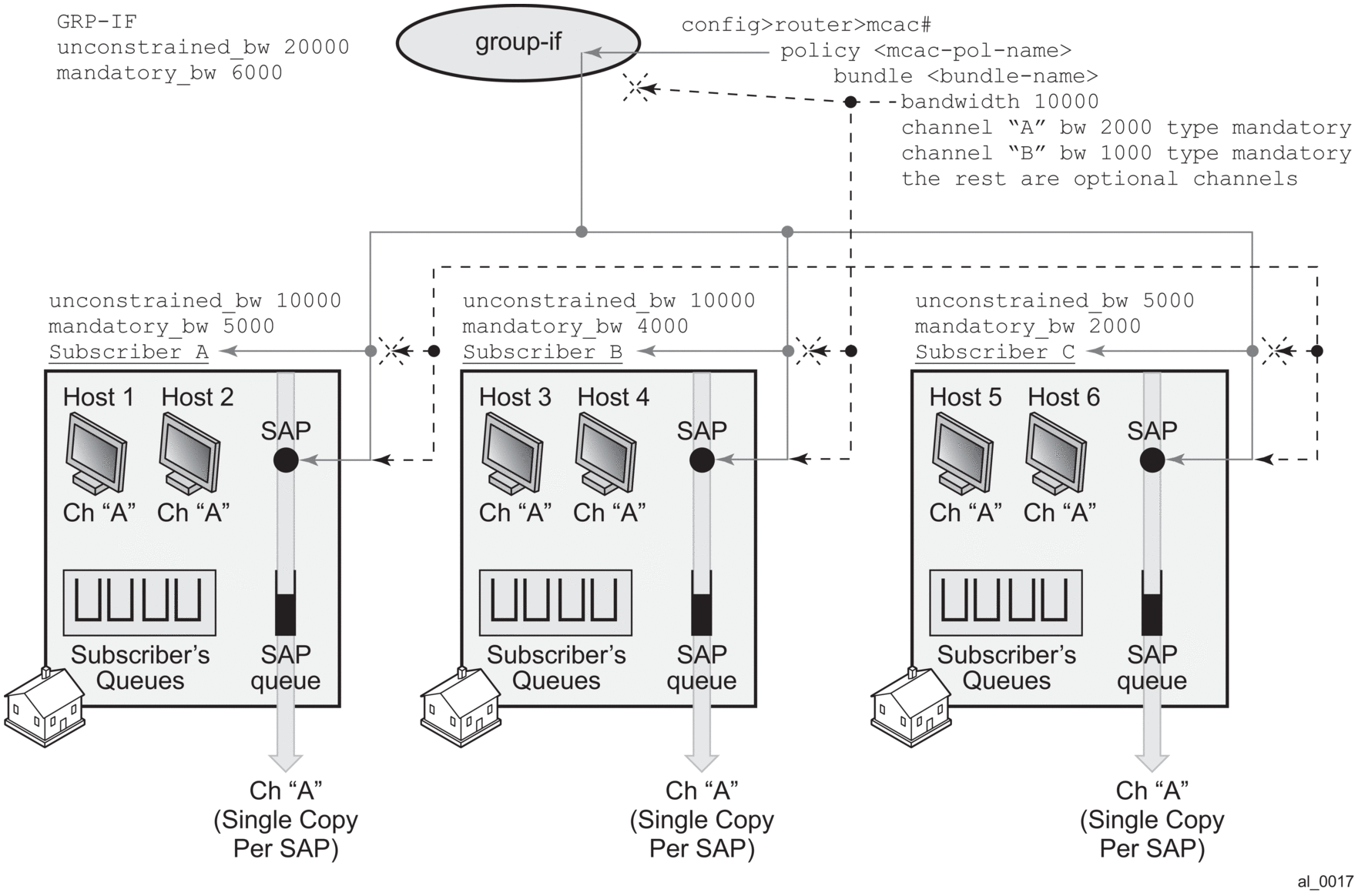 Figure 66 depicts behavior in per-host replication mode. MCAC policy inheritance flow is the same as in the previous example with the difference that the bundle limit has no effect at all. Each host generates its own copy of the same multicast stream that is flowing through subscriber queues and not the SAP queue. Since each of the copies counts towards the subscriber or group-interface bandwidth limits, the multicast bandwidth consumption is higher in this example. This needs to be reflected in the configured multicast bandwidth limits. For example, the group-interface mandatory bandwidth limit is increased to 12 Mb/s.