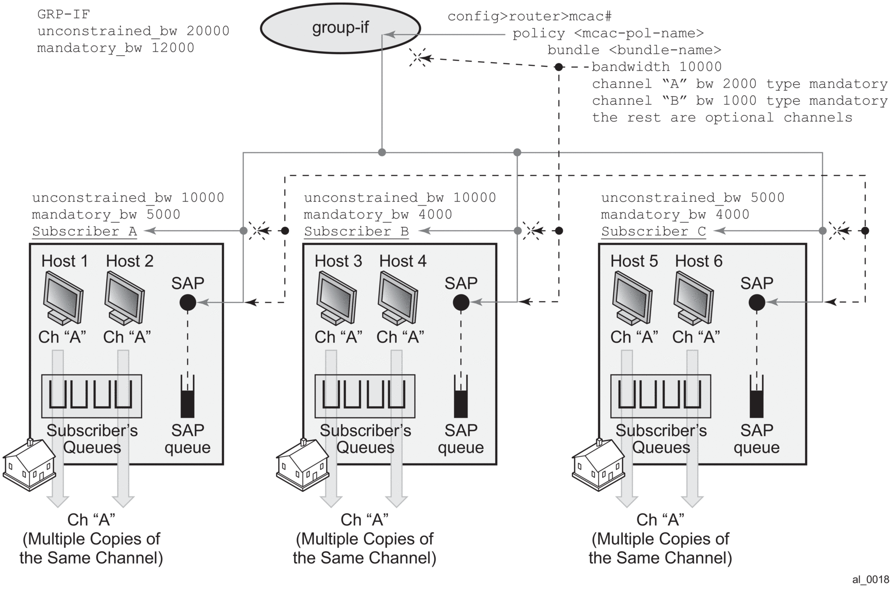 Two levels of MCAC can be enabled simultaneously and in such case this is referred as Hierarchical MCAC (H-MCAC). In case that redirection is enabled, H-MCAC per subscriber and the redirected interface is supported. However, MCAC per group-interface in this case is not supported. Channel definition policy for the subscriber and the redirected interface is in this case referenced under the config>router>igmp->interface (redirected interface) CLI hierarchy or IPv6 config>router>mld->interface.
