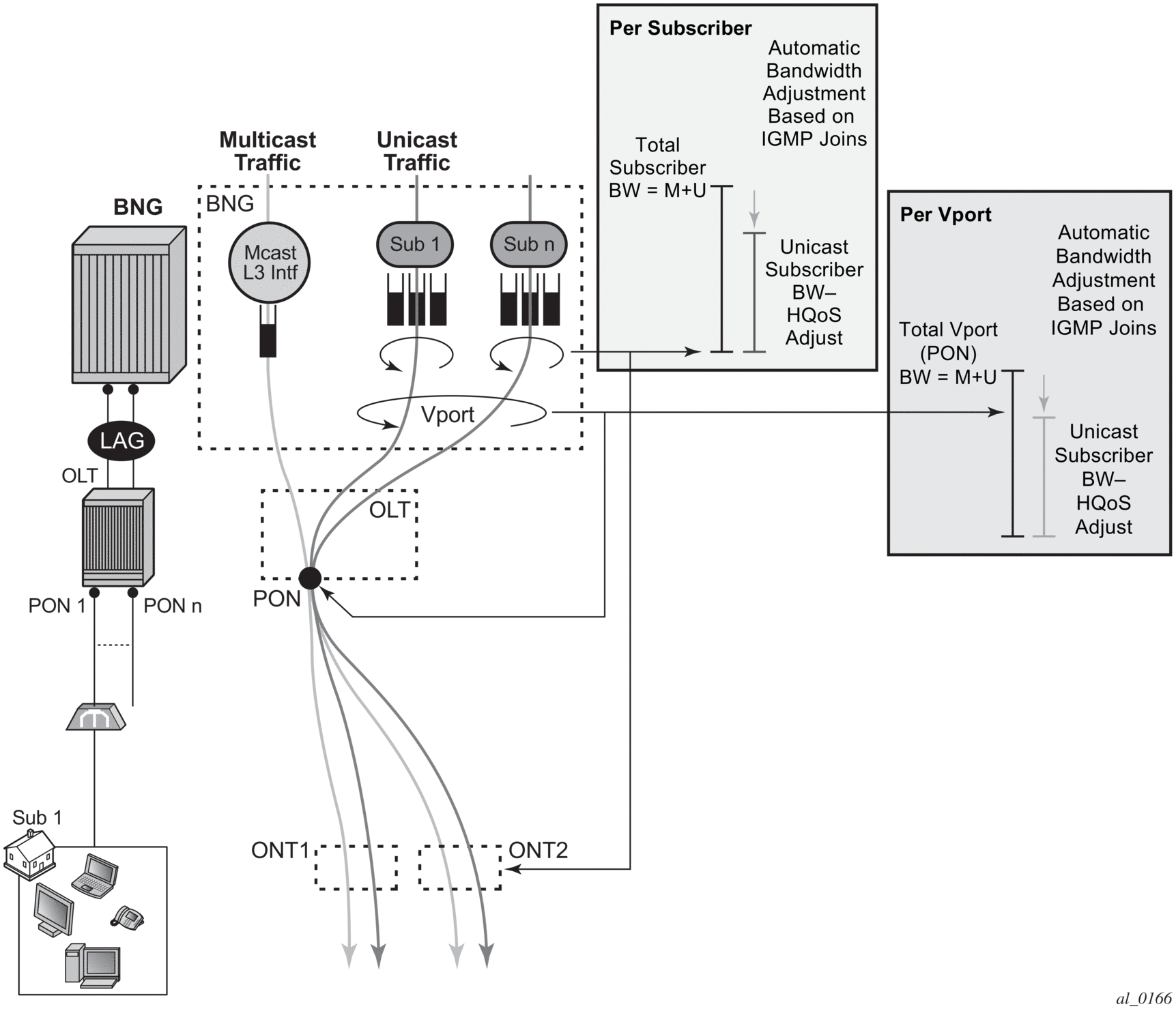HQoS adjust per Vport can be used in environments where Vport represents a physical medium over which traffic for multiple subscribers is shared. Typical example of this scenario is shown in Figure 64. Multicast traffic within the router is taking a separate path from unicast traffic, only for the two traffic flows to merge later in the PON (represented by a Vport) and ONT (represented by the subscriber in the 7450 ESS and 7750 SR).