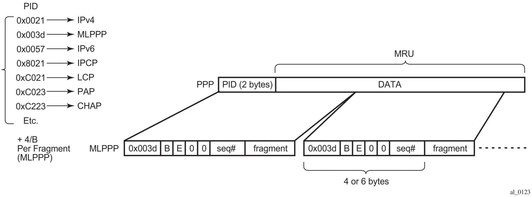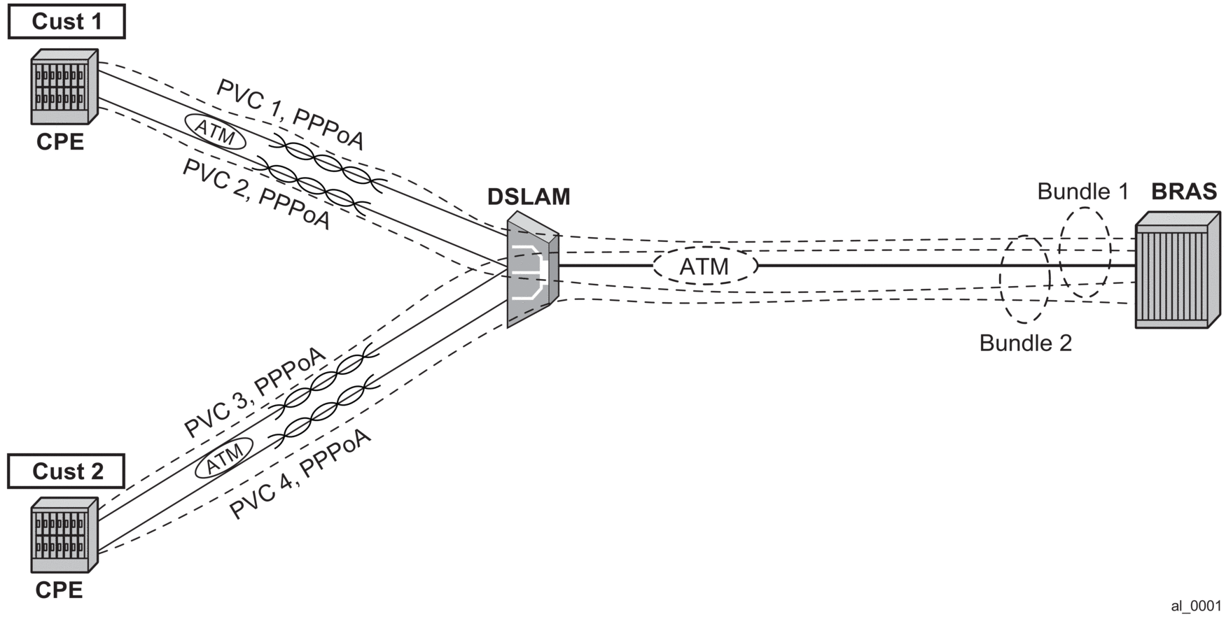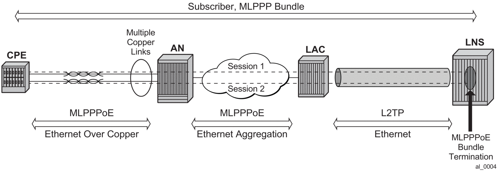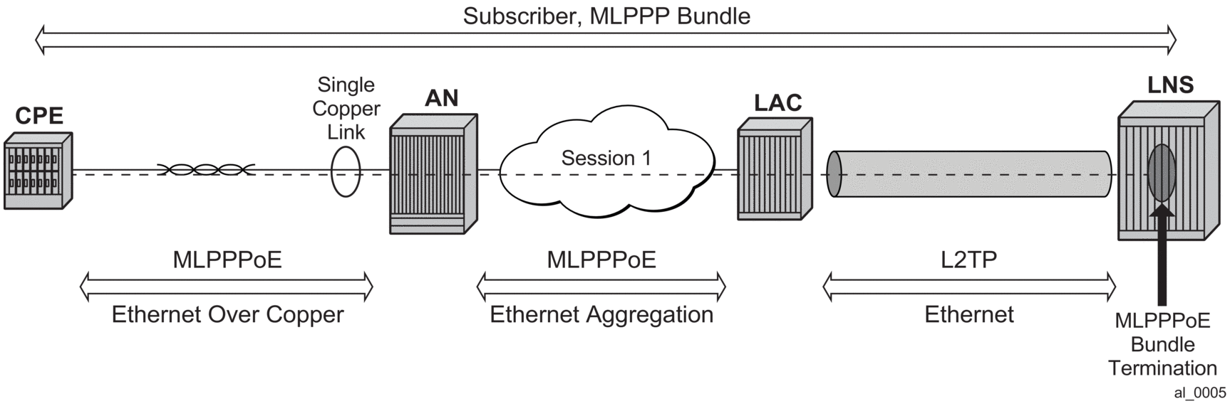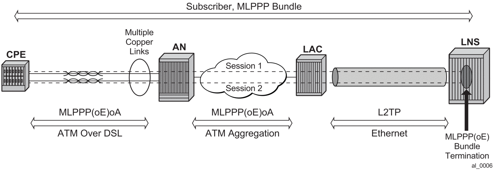 The term MLPPPoX is used to reference MLPPP sessions over ATM transport (oA), Ethernet over ATM transport (oEoA) or Ethernet transport (oE). Although MLPPP in subscriber management context is not supported natively over PPP/HDLC links, the terms MLPPP and MLPPPoX terms can be used interchangeably. The reason for this is that link bundling, MLPPP encapsulation, fragmentation and interleaving can be in a broader scope observed independently of the transport in the first mile. However, MLPPPoX terminology prevails in this section in an effort to distinguish MLPPP functionality on an ASAP MDA (outside of ESM) and MLPPPoX in LNS (inside of ESM).