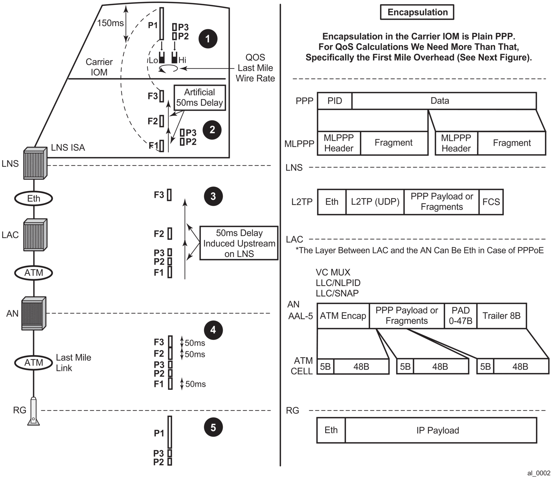 Accurate QoS, amongst other things, require that the subscriber rates in the first mile on an MLPPPoX bundle be properly represented in the LNS. In other words, the rate limiting functions in the LNS must account for the last mile on-the-wire encapsulation overhead. The last mile encapsulation can be Ethernet or ATM.
