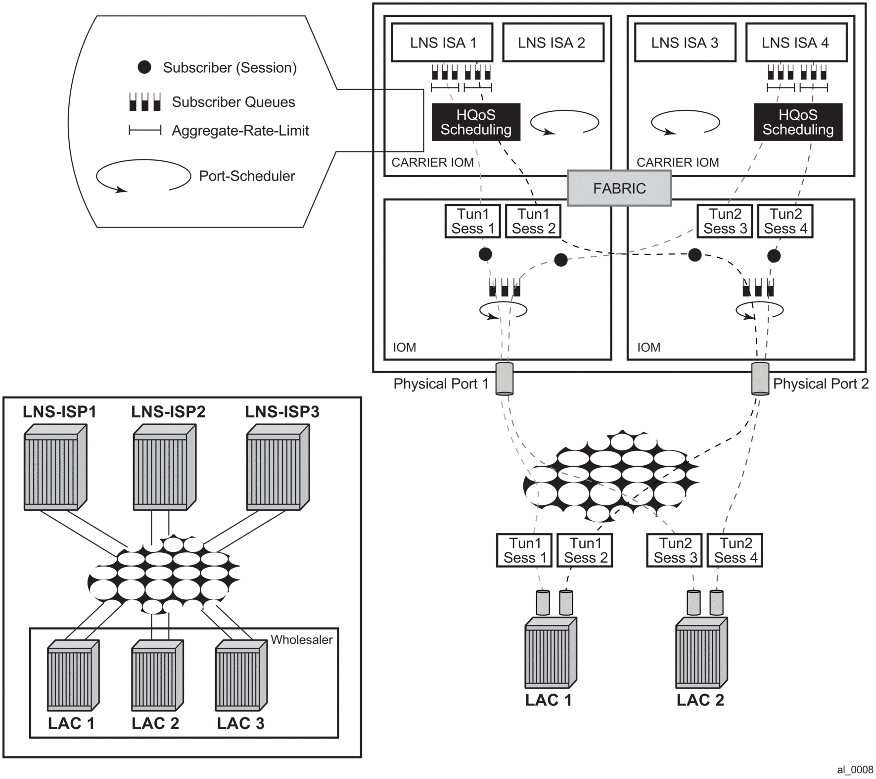 The subscriber aggregate rates (agg-rate-limit) used in (H)QoS on the carrier IOM and in the BB-ISA (for interleaving) must be wire based in the last mile. This rule applies equally to both, the LAC and LNS.