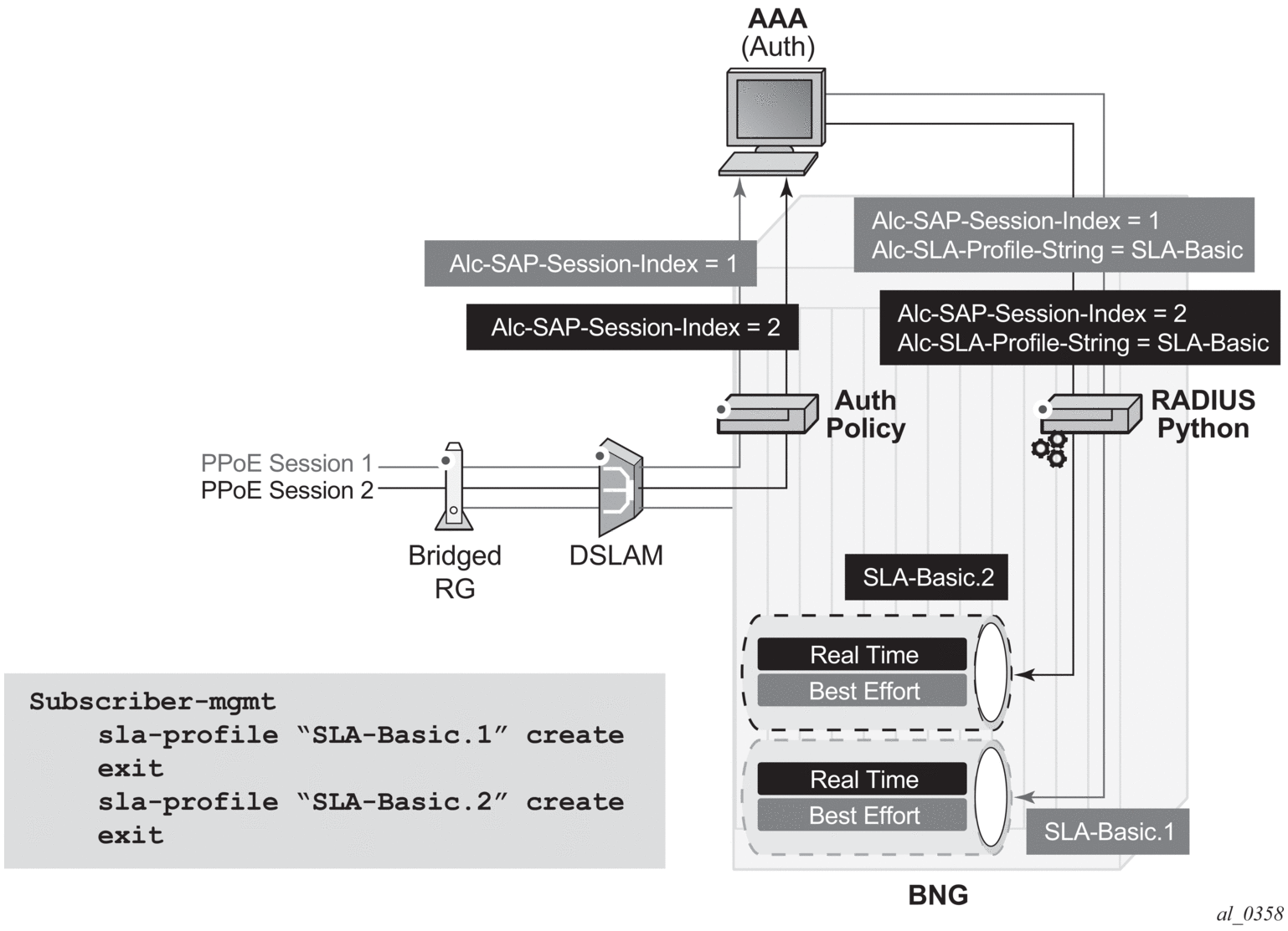 A Python script processes the RADIUS Access-Accept message to append the SAP session index to the SLA profile name to create the unique SLA profile name, in this example with the format: