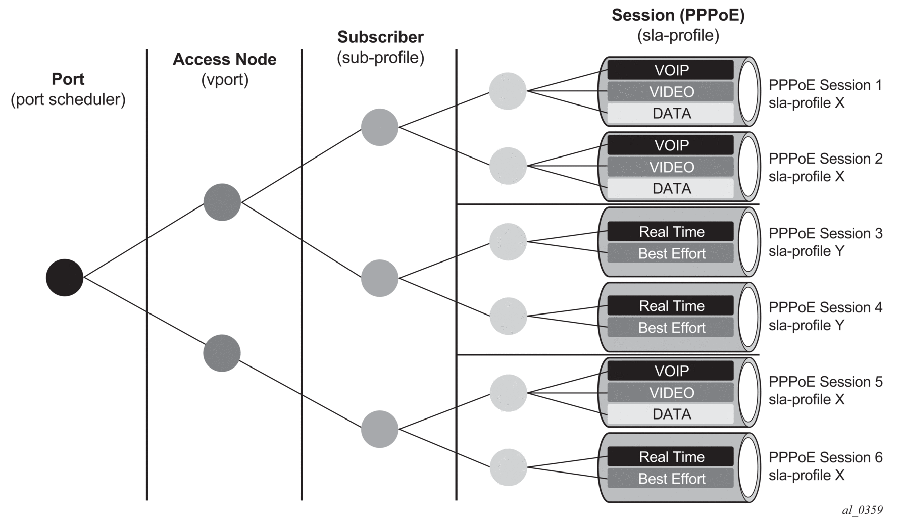 The SAP session index allows PPPoE sessions to have their own set of queues for QoS and accounting purposes when using the same SLA profile name as that received from a RADIUS server. An example of this with multiple levels of HQoS egress scheduling is shown in Figure 34. Alternatively, this can be achieved by configuring per-session SPI sharing in the SLA profile as described in SLA Profile Instance Sharing.
