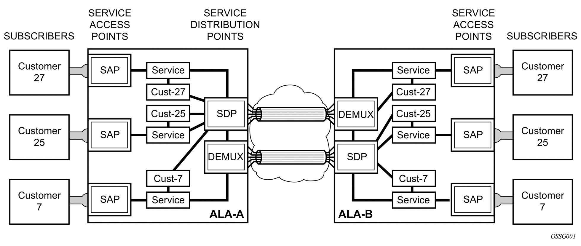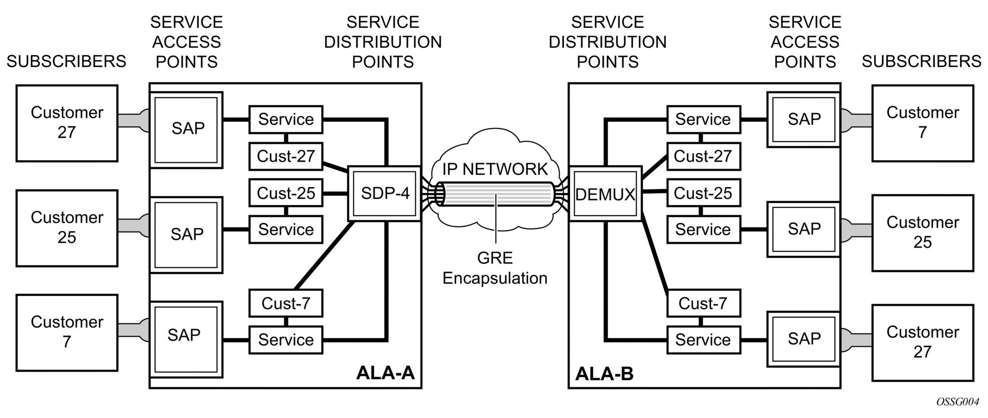 In the 7450 ESS and 7750 SR service model, the service edge routers are deployed at the provider edge. Services are provisioned on the routers and transported across an IP and/or IP/MPLS provider core network in encapsulation tunnels created using Generic Router Encapsulation (GRE) or MPLS Label Switched Paths (LSPs).