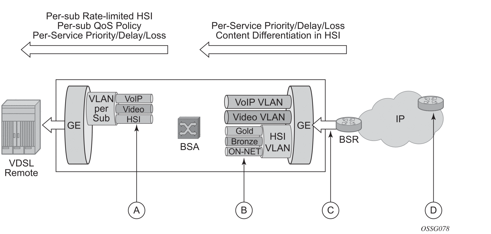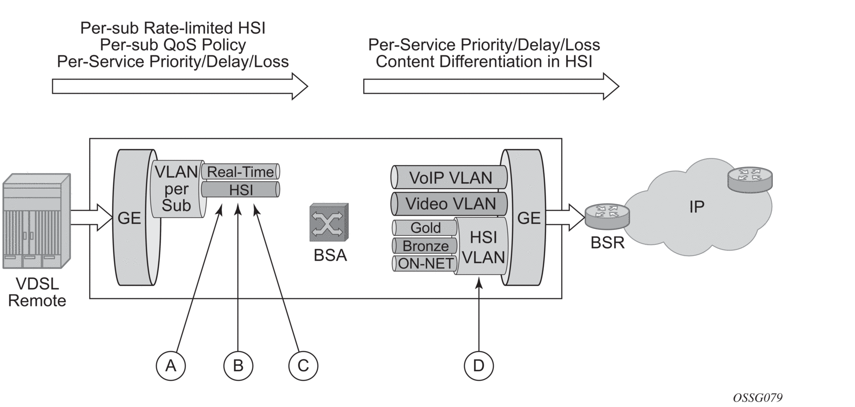D | Video and VoIP: Policy defines priority aggregate CIR and PIR. HSI: QoS policy defines priority and aggregate CIR and PIR. Content differentiation based on ingress classification. DSCP is marked. |