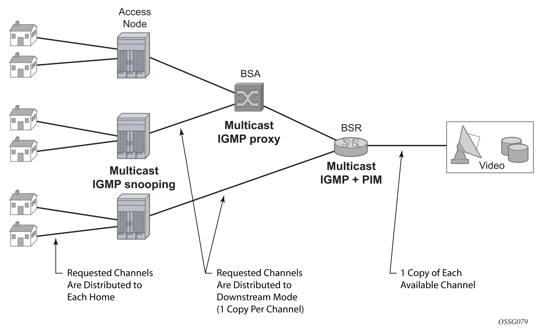 Efficient multicasting requires the distribution of functions throughout the access and the aggregation network to avoid overloading the network capacity with unnecessary traffic. TPSDA realizes efficient multicasting by implementing IGMP snooping in the access nodes, IGMP snooping in the BSA and multicast routing in the BSR (Figure 5).