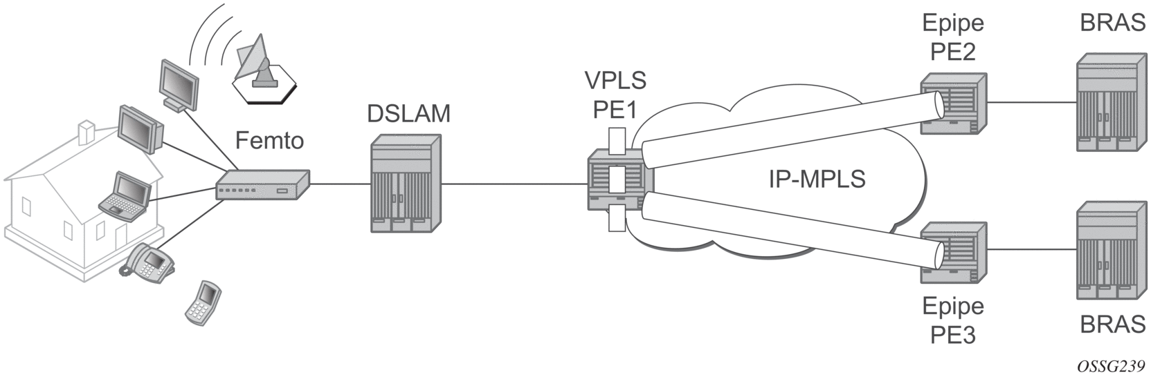 Figure 6 displays a Layer 2 PE network (such as the ESS-Series) aggregating traffic from DSLAMs (Nokia) to BRAS devices. The VPLS service is running in the PEs directly connected to the DSLAMs (VPLS PE1) while the PEs connected to the BRAS devices are running a point-to-point Layer 2 service (Epipe).