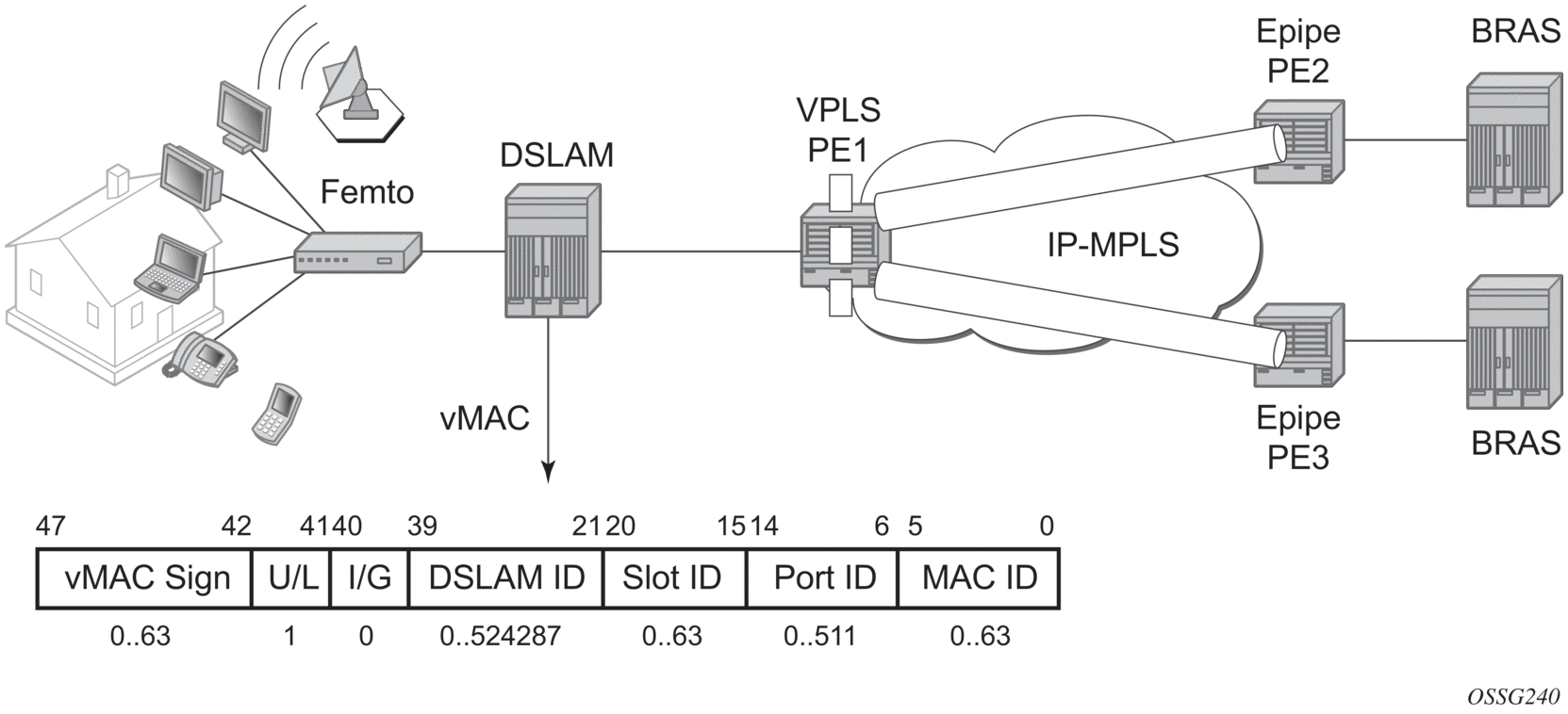 Nokia DSLAMs have the capability to map every customer MAC to a service provider MAC using the virtual MAC addressing scheme depicted in Figure 7.