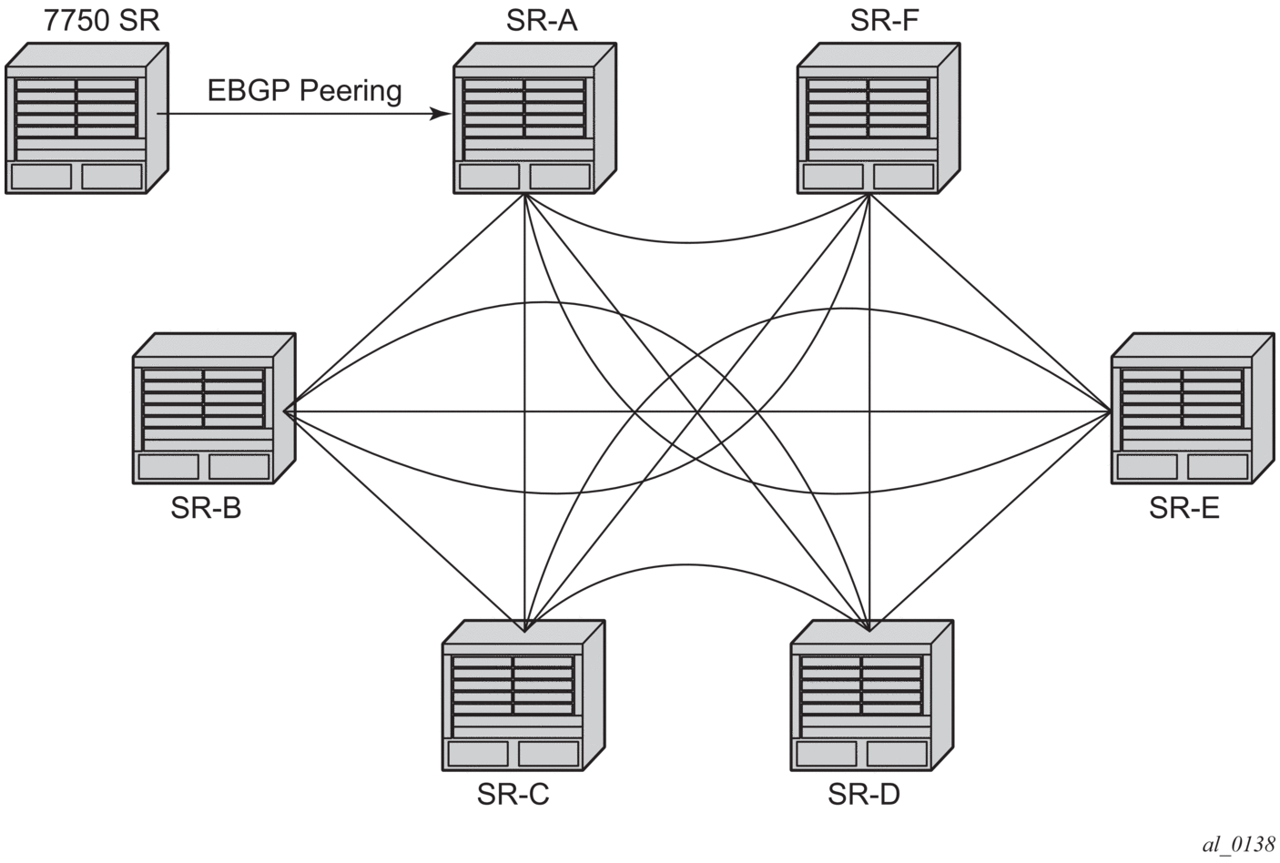 Figure 36 depicts the same network as Figure 35 but with route reflectors deployed to eliminate the IBGP mesh between SR-B, SR-C, and SR-D. SR-A, configured as the route reflector, is responsible for reflection routes to its clients SR-B, SR-C, and SR-D. SR-E and SR-F are non-clients of the route reflector. As a result, a full mesh of IBGP sessions must be maintained between SR-A, SR-E and SR-F.