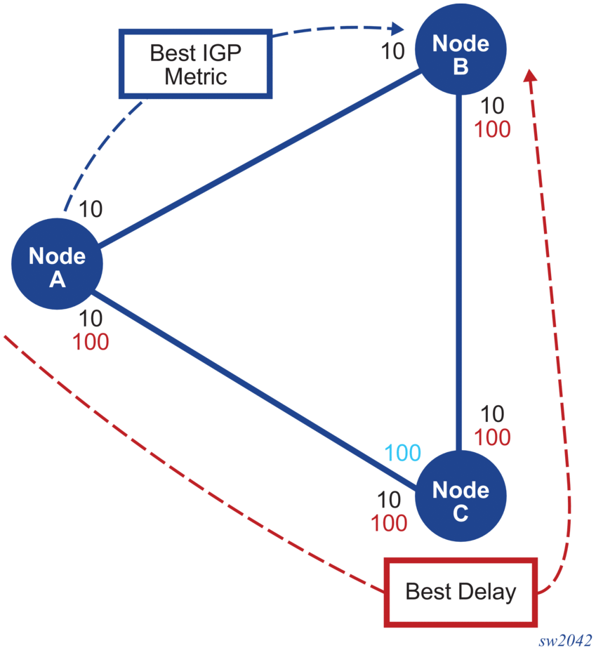 For example, algorithm 128 has been configured to use the delay metric, and consequently forwards traffic using the lowest delay through the network. In Figure 33, Node B is configured with IP address 10.20.1.2/32, the A-B path has the best default IGP metric, and the A-C-B path has the best delay.