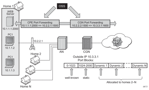 The 7750 SR supports all three methods following the best-practice RFC for TCP (RFC 5382, NAT Behavioral Requirements for TCP) and UDP (RFC 4787, Network Address Translation (NAT) Behavioral Requirements for Unicast UDP). Port Forwarding is supported on the 7750 SR to allow servers which operate on well-known ports <1024 (such as HTTP and SMTP) to request the appropriate outside port for permanent allocation.