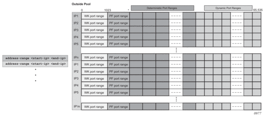 Port-range — A collection of ports that can spawn multiple port blocks of the same type. For example, deterministic port-range includes all ports that are reserved for deterministic consumption. Similarly dynamic port-range is a total collection of ports that can be allocated in the form of dynamic port blocks. Other types of port-ranges are well-known ports and static port forwards.