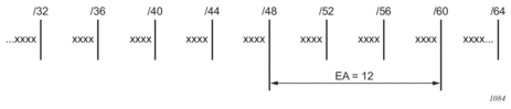 The IPv6 rule prefix is the next parameter in the MAP rule. Figure 103 shows the relevant bits in the IPv6 address: only bits /32 to /64 are considered; the irrelevant bits of the IPv6 addresses are ignored in this example.