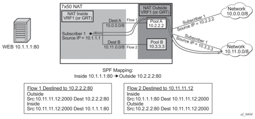 NAT Subscriber — in NAT terminology a NAT subscriber is an inside entity whose true identity is hidden from the outside. There are a few types of NAT implementation in 7750 SR and subscribers for each implementation are defined as follows: