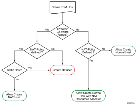 L2-Aware NAT — In the context of 7750 SR platform combines Enhanced Subscriber Management (ESM) subscriber-id and inside IP address to perform translation into a unique outside IP address and outside port. This is in contrast with classical NAT technique where only inside IP is considered for address translations. Since the subscriber-id alone is sufficient to make the address translation unique, L2-Aware NAT allows many ESM subscribers to share the same inside IP address. The scalability, performance and reliability requirements are the same as in LSN.