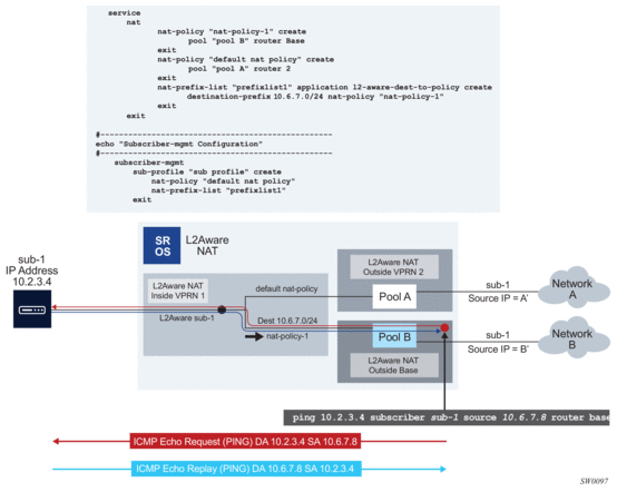 Layer-2 Aware (or subscriber aware) NAT is combined with Enhanced Subscriber Management on the 7750 SR BNG to overcome the issues of colliding address space between home networks and the inside routed network between the customer and Large Scale NAT.