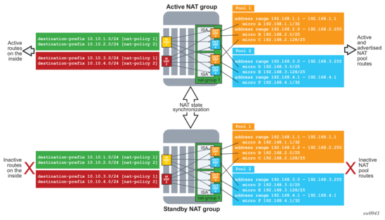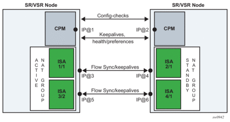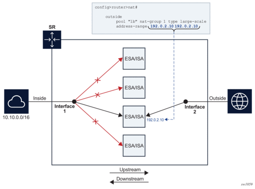 NAT traffic in SR OS is distributed over ISAs and ESAs within each NAT group. As a result, NAT capacity grows incrementally by adding more ISAs and ESAs to the system while each ISA or ESA participates equally in load sharing.