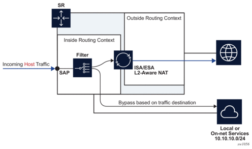 L2-Aware NAT bypass refers to the functionality where the entire or partial traffic from a L2-Aware-NAT-enabled ESM1 subscriber circumvents local NAT function. There are three types of bypass supported for L2-Aware NAT in the SR OS: