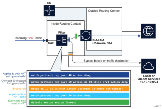 Once the selective L2-Aware NAT bypass is enabled, the determination whether certain traffic from a host bypasses NAT comes via an IP filter with a newly defined action l2-aware-nat-bypass. This new action must be configured in addition to the existing action accept (in MD-CLI) or forward (in classic CLI). This defined set of actions divert identified traffic away from NAT.