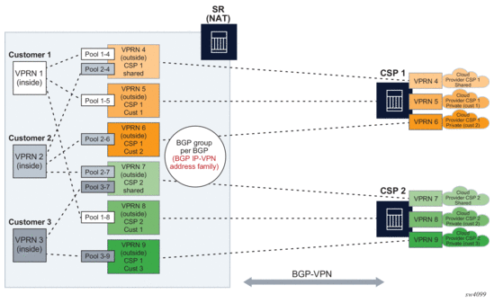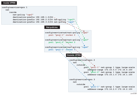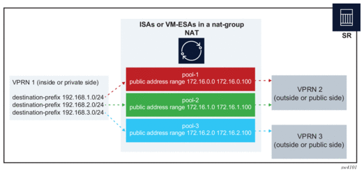 The 7750 SR NAT implementation supports NAT in the base routing instance and VPRN, and through NAT traffic may originate in one VPRN (the inside) and leave through another VPRN or the base routing instance (the outside). This technique can be employed to provide customers of IP MPLS VPN with Internet access by introducing a default static route in the customer VPRN, and NATing it into the Internet routing instance.
