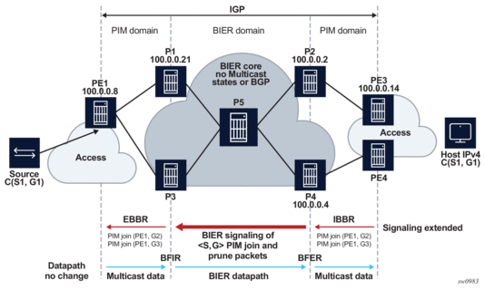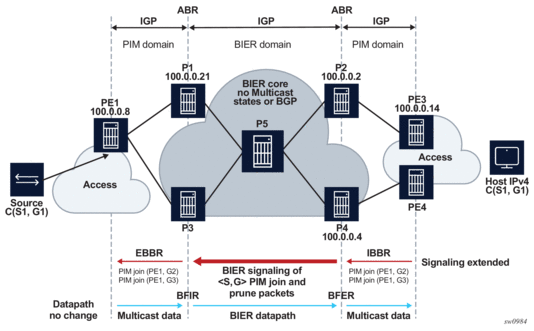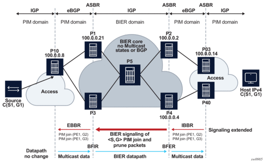 The PIM signaling messages arriving at the IBBR are encapsulated in a BIER header and forwarded to the EBBR. The EBBR tracks every IBBR that is interested in a specific (S,G). The EBBR forwards the join and prune messages to the PIM domain to which it is attached. When the source receives a join message, it starts the multicast flow for this (S,G). When these PDUs arrive on the EBBR, the EBBR notes all IBBRs that are interested in the (S,G) and adds the IBBRs’ corresponding BIER bits to the BIER header. The EBBR (BFIR) forwards the BIER packets with the PDU as payload to the IBBRs (BFERs), where the BIER header is removed and the packet is forwarded on the interface where the join (S,G) was received.