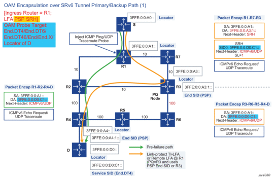 As shown in Figure 35, the network administrator originates an ICMP ping or a UDP traceroute probe on node R1 to test the path of an SRv6 locator of node D, an SRv6 segment identifier (SID) owned by node D, or an IP prefix resolved to an SRv6 tunnel towards node D. R1 is referred to as the sender node. Node D is referred to as the target node because it owns the target locator or SID that is being tested. In general, a target node can be any router in the SRv6 network domain which either owns the target locator or SID, or a router in which the OAM probe was extracted due to matching a local route or due to the value of the hop-limit field setting in the packet.