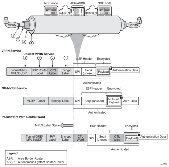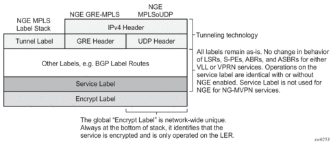 The global encryption label is used to identify packets that have an NGE-encrypted payload and is added to the bottom of the stack. This allows network elements such as LSRs, ABRs, ASBRs, and RRs to forward NGE packets without needing to understand NGE or to know that the contents of these MPLS packets are encrypted. Only when a destination PE receives a packet that needs to be understood at the service layer does the PE check for an encryption label, and then decrypt the packet.