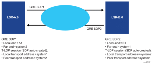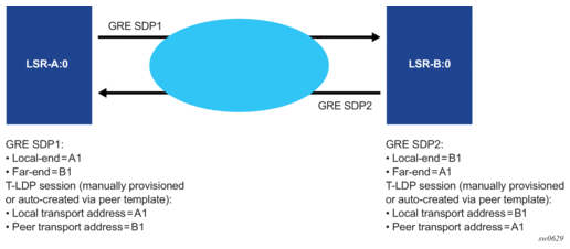 For services that use SDPs, all tunnels may be either MPLS LSPs (RSVP-TE, LDP, or static LSP), or GRE or MPLSoUDP tunnels.
