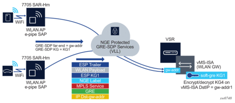 NGE is supported on the WLAN-GW to provide encryption of traffic to and from WLAN APs that support NGE, such as the 7705 SAR-Hm. As shown in Figure 35, the application uses Epipe pseudowire services, as described in Pseudowire Switching for NGE Traffic and Pseudowire Control Word for NGE Traffic, with L2oMPLSoGRE transport and NGE applied to the GRE-SDP.