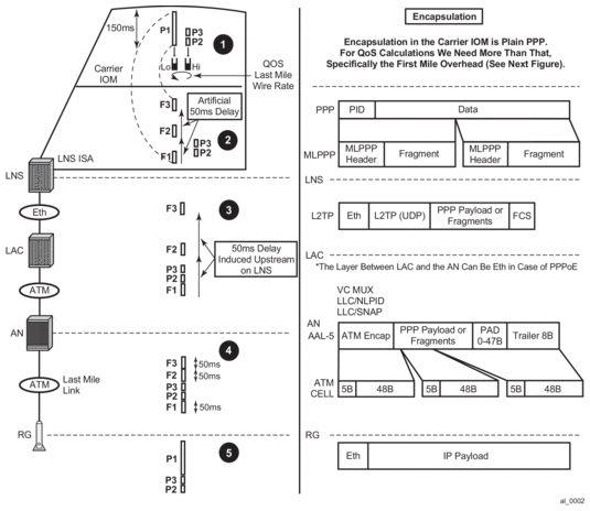 The delivery of high priority traffic within predefined delay bounds on a slow speed last mile link is ensured by proper QoS classification and prioritization. High priority traffic is interleaved with low priority fragments on a single link MLPPPoX bundle with LFI enabled. The classification of traffic into proper (high or low priority) forwarding class is performed on the downstream ingress interface. However, traffic can be re-classified (re-mapped into another forwarding class) on the egress access interface of the carrier IOM, just before packets are transmitted to the BB-ISA for MLPPPoX processing. This can be achieved with a QoS sap-egress policy referenced in the LNS sla-profile.