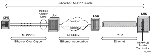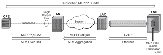 The term MLPPPoX is used to reference MLPPP sessions over ATM transport (oA), Ethernet over ATM transport (oEoA) or Ethernet transport (oE). Although MLPPP in subscriber management context is not supported natively over PPP/HDLC links, the terms MLPPP and MLPPPoX terms can be used interchangeably. The reason for this is that link bundling, MLPPP encapsulation, fragmentation and interleaving can be in a broader scope observed independently of the transport in the first mile. However, MLPPPoX terminology prevails in this section in an effort to distinguish MLPPP functionality on an ASAP MDA (outside of ESM) and MLPPPoX in LNS (inside of ESM).