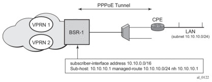 From a BNG perspective, the given PPPoE host is allocated a subnet (instead of /32) by RADIUS, external dhcp-server, or local-user-db. And locally, the host is associated with managed-route. This managed-route is a subset of the subscriber-interface subnet, and also, subscriber-host ip-address is from managed-route range. The negotiation between BNG and CPE allows CPE to be allocated both ip-address and associated subnet.