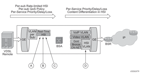 D | Video and VoIP: Policy defines priority aggregate CIR and PIR. HSI: QoS policy defines priority and aggregate CIR and PIR. Content differentiation based on ingress classification. DSCP is marked. |