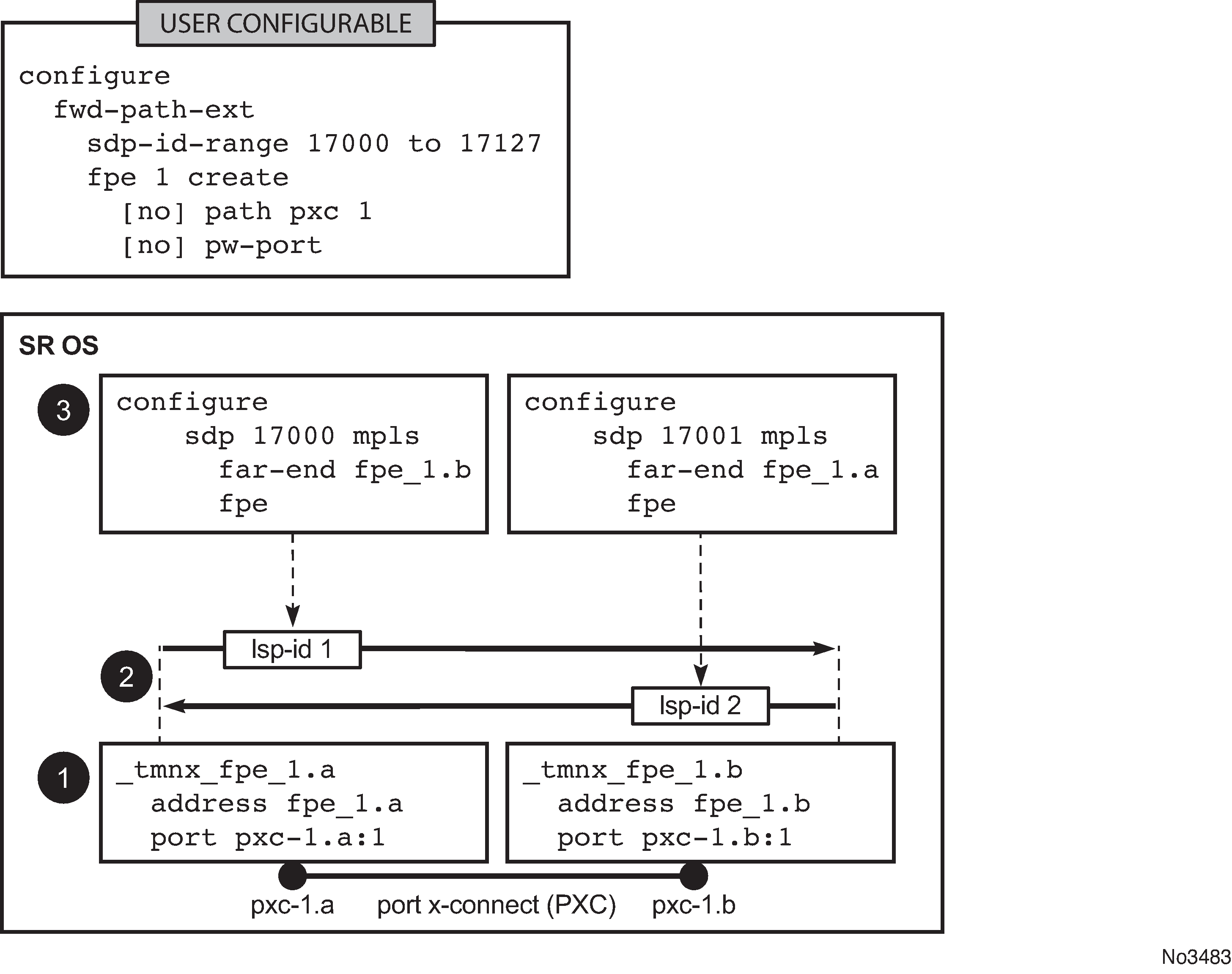 After the fpe is configured (see the 7450 ESS, 7750 SR, 7950 XRS, and VSR Interface Configuration Guide, "Forwarding Path Extensions"), the SR OS system automatically configures steps 1, 2 and 3 in Figure: Building the internal LSP over PXCs. The objects created in steps 1, 2 and 3 can be seen via show commands. However, they are not visible to the operator in the configure branch of CLI.