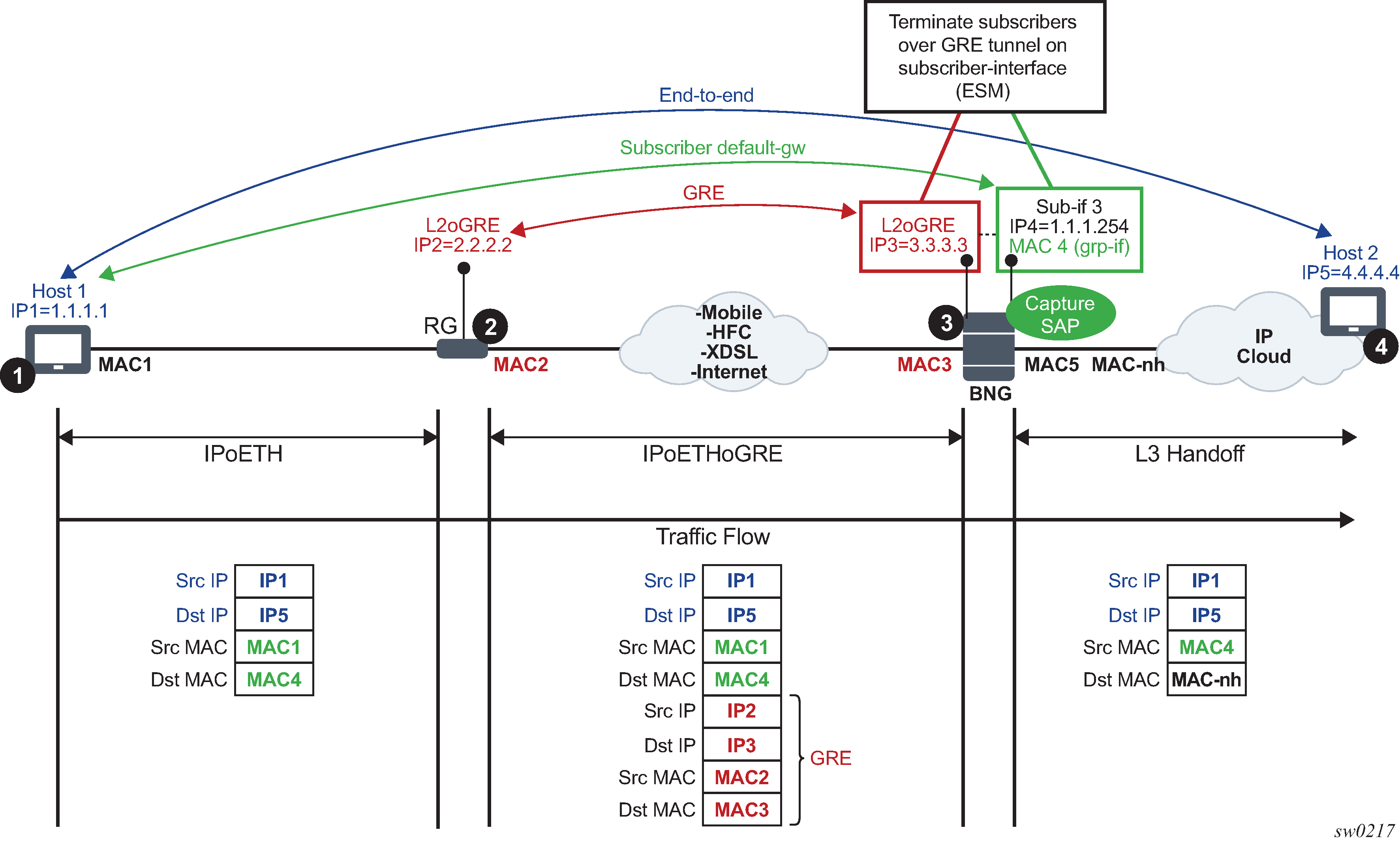 RG (Residential Gateway) at point 2 encapsulates L2 customer frames into GRE and sends them the SR OS node (7x50 BNG).
