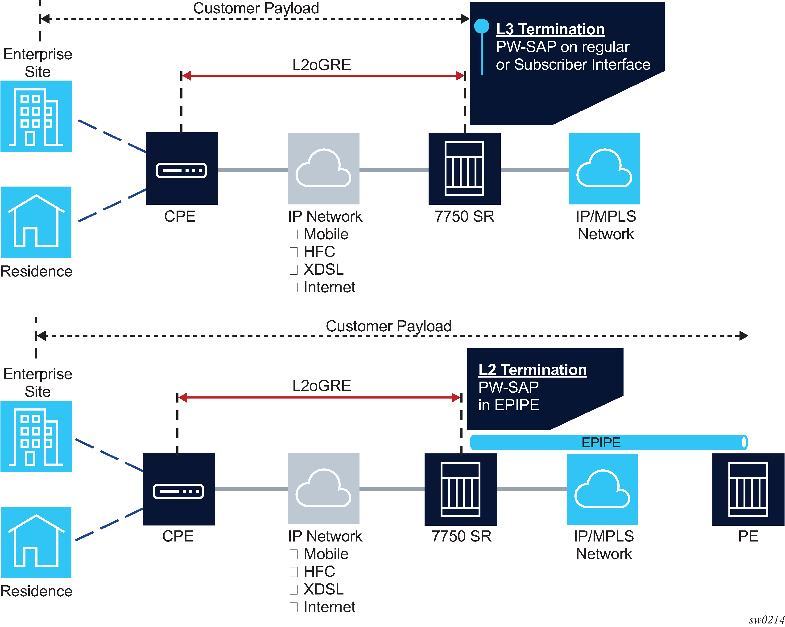 L2oGRE termination on an FPE-based PW port allows Layer 2 customer traffic to be transported over an IP network to an SR OS node deeper in the network. In the SR OS node, the customer's payload delivered within L2oGRE tunnel is extracted onto a PW SAP (configured under an interface, group interface, or Epipe) and handed off to an Layer 2 or Layer 3 service. This allows the operator to quickly and simply expand their service offering to their customers over an existing IP network. New service offerings become independent of the existing IP network to which CEs are attached.