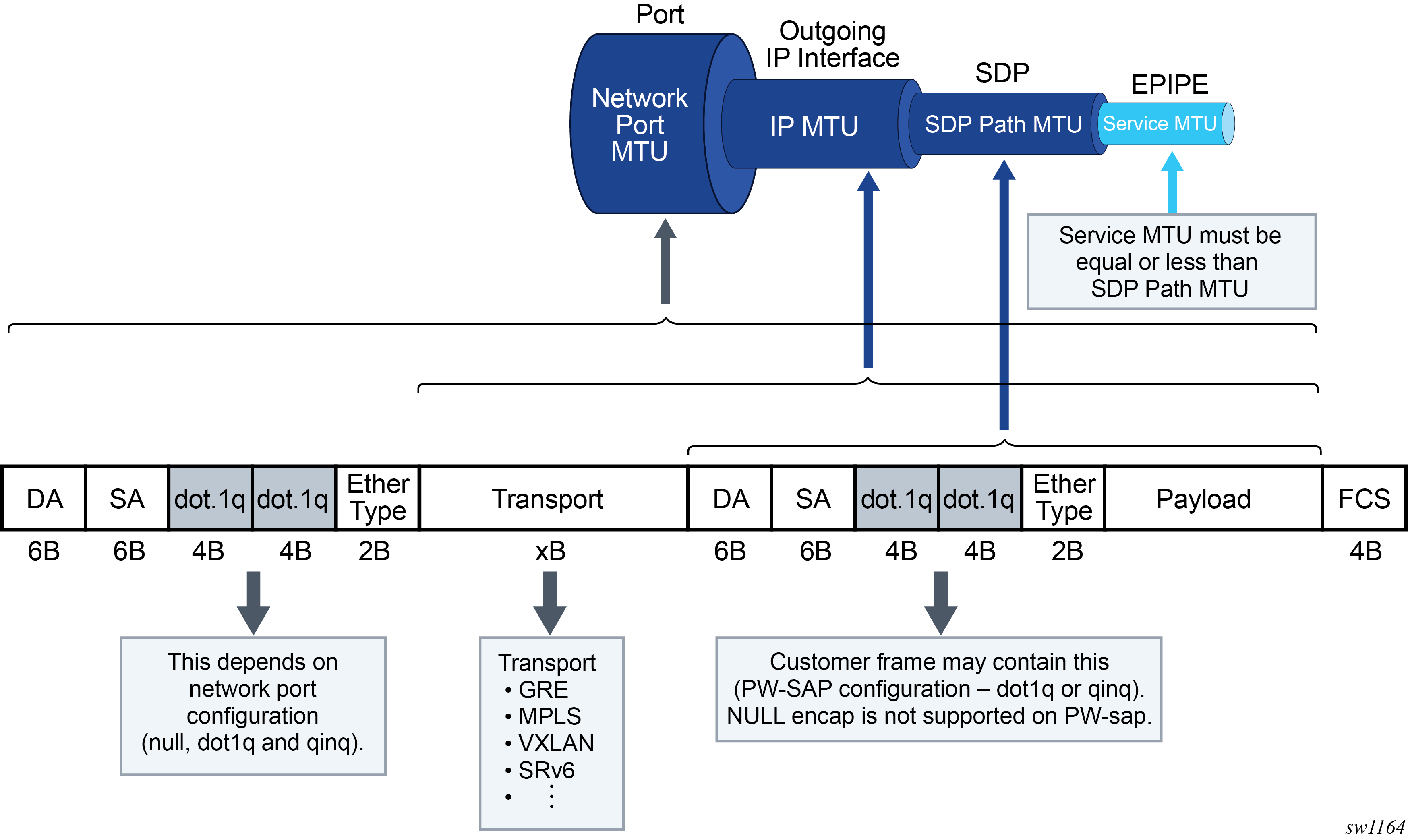 A generic SDP-based tunnel (such as a L2oGRE or TLDP GRE/MPLS tunnel) under an Epipe service has the following configurable MTUs: