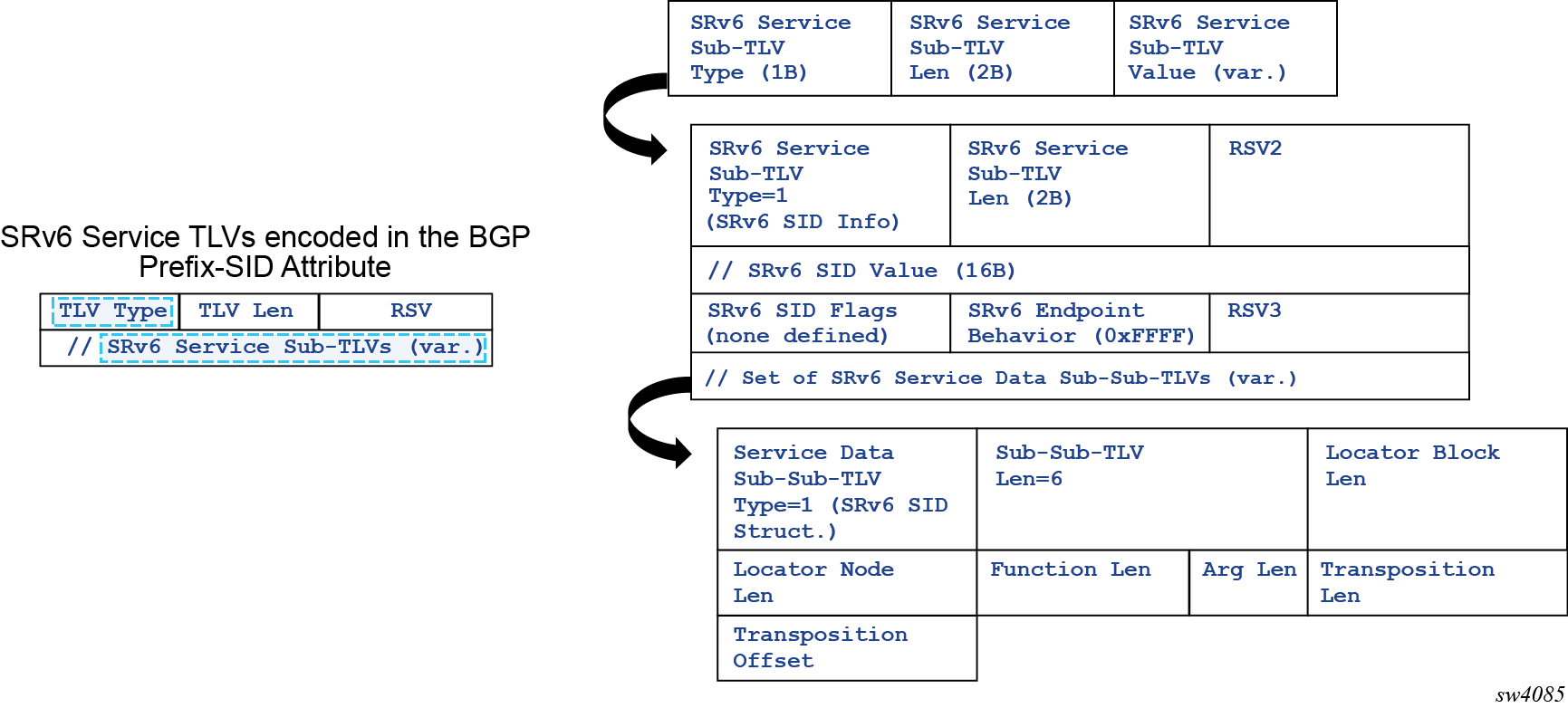 The SRv6 Service TLV may contain an unordered list of sub-TLVs, but currently the SRv6 Service TLV is advertised with only one sub-TLV – the SRv6 SID Info sub-TLV (type 1). This sub-TLV encodes the following information: