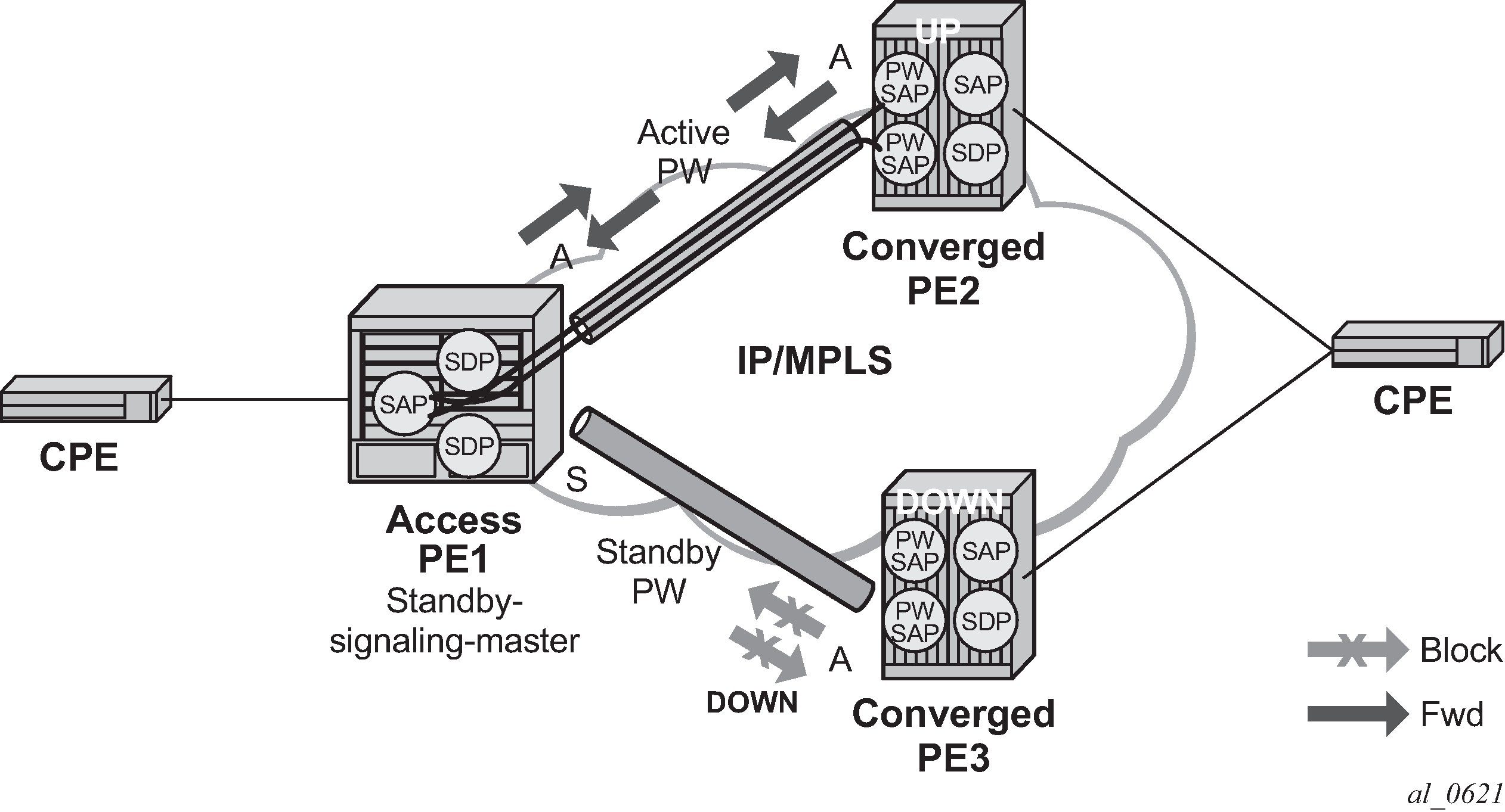 As in the existing implementation, standby-signaling-master is configured on the Spoke-SDP at the access PE. However explicit configuration of standby-signaling-slave on the PW port is not required, as this is the default behavior.
