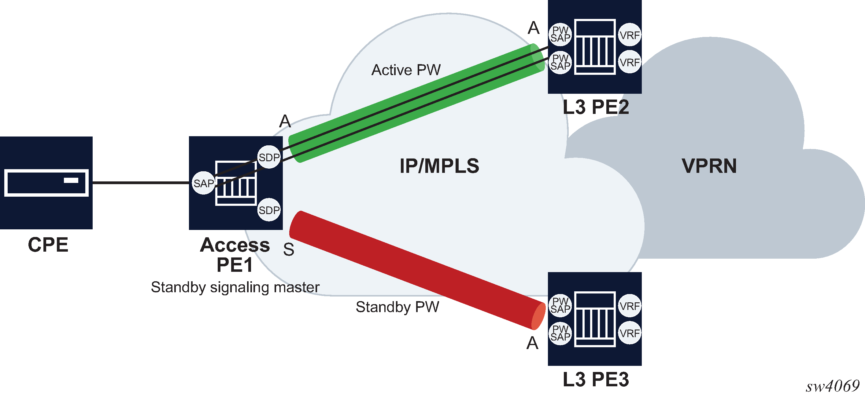 Dual homing operates in a similar manner to Spoke-SDP termination on IES/VPRN. Figure: Dual homing into multiple Layer 3 PEs displays the access PE is dual-homed to the Layer 3 PEs using two spoke-SDPs. The endpoint in the access PE is configured to be the master from a pseudowire redundancy perspective using the standby-signaling-master command. The access PE picks one of the Spoke-SDPs to make active, and one to make standby, based on the local configuration of primary or spoke SDP precedence.