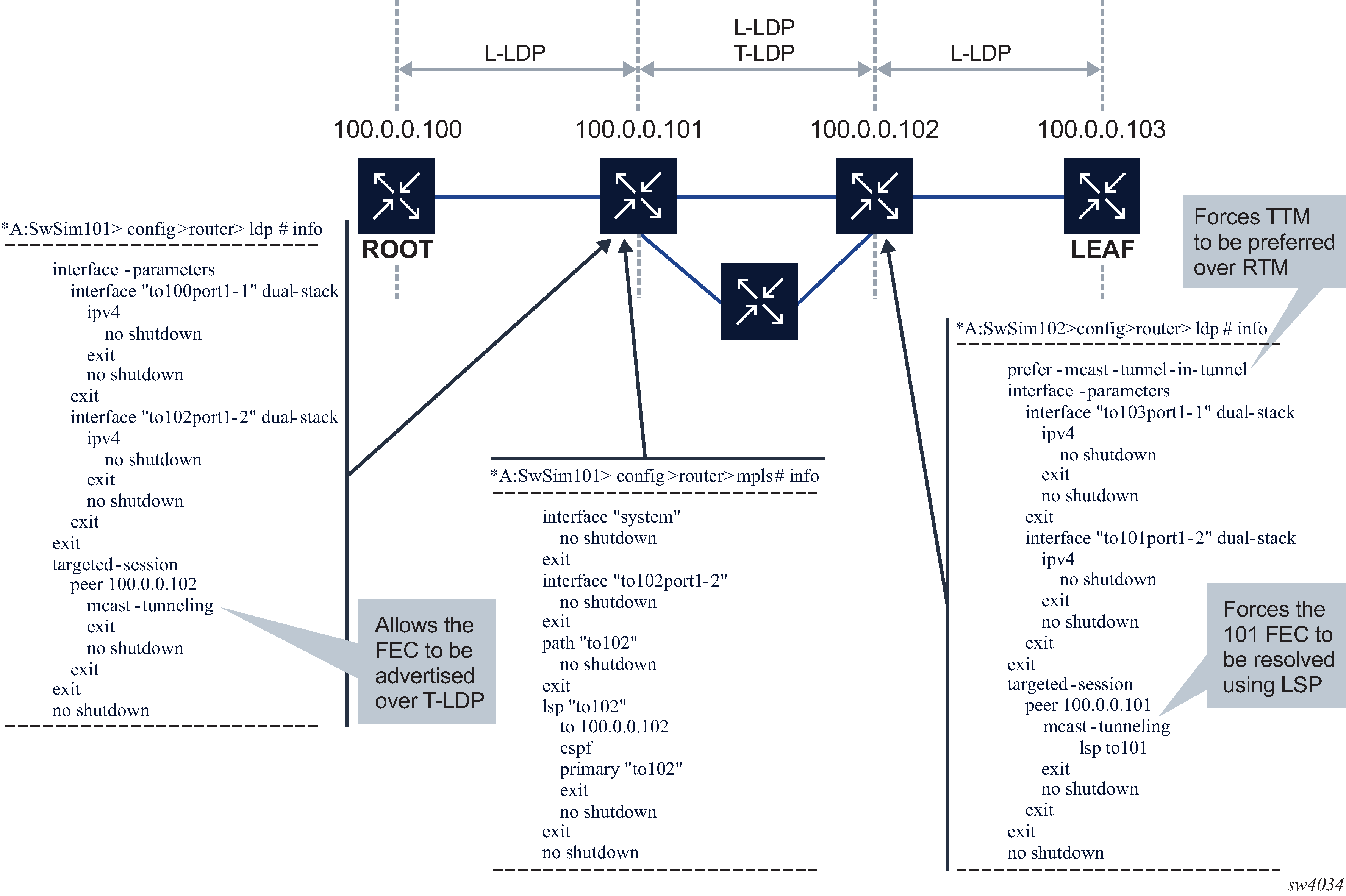 As shown in Figure: Configuring MLDP over RSVP P2P LSP, when the LSR 100.0.0.102 and LSR 100.0.0.101 nodes are directly connected, the T-LDP and link-LDP adjacencies share a common LDP session. The P2MP FEC is advertised over the LDP session and is received by LSR 100.0.0.102, which resolves it over the RSVP LSP if the mcast-tunneling option is enabled. The prefer-mcast-tunnel-in-tunnel option in LDP dictates if the MLDP FEC is resolved in preference to the tunnel or to the link.