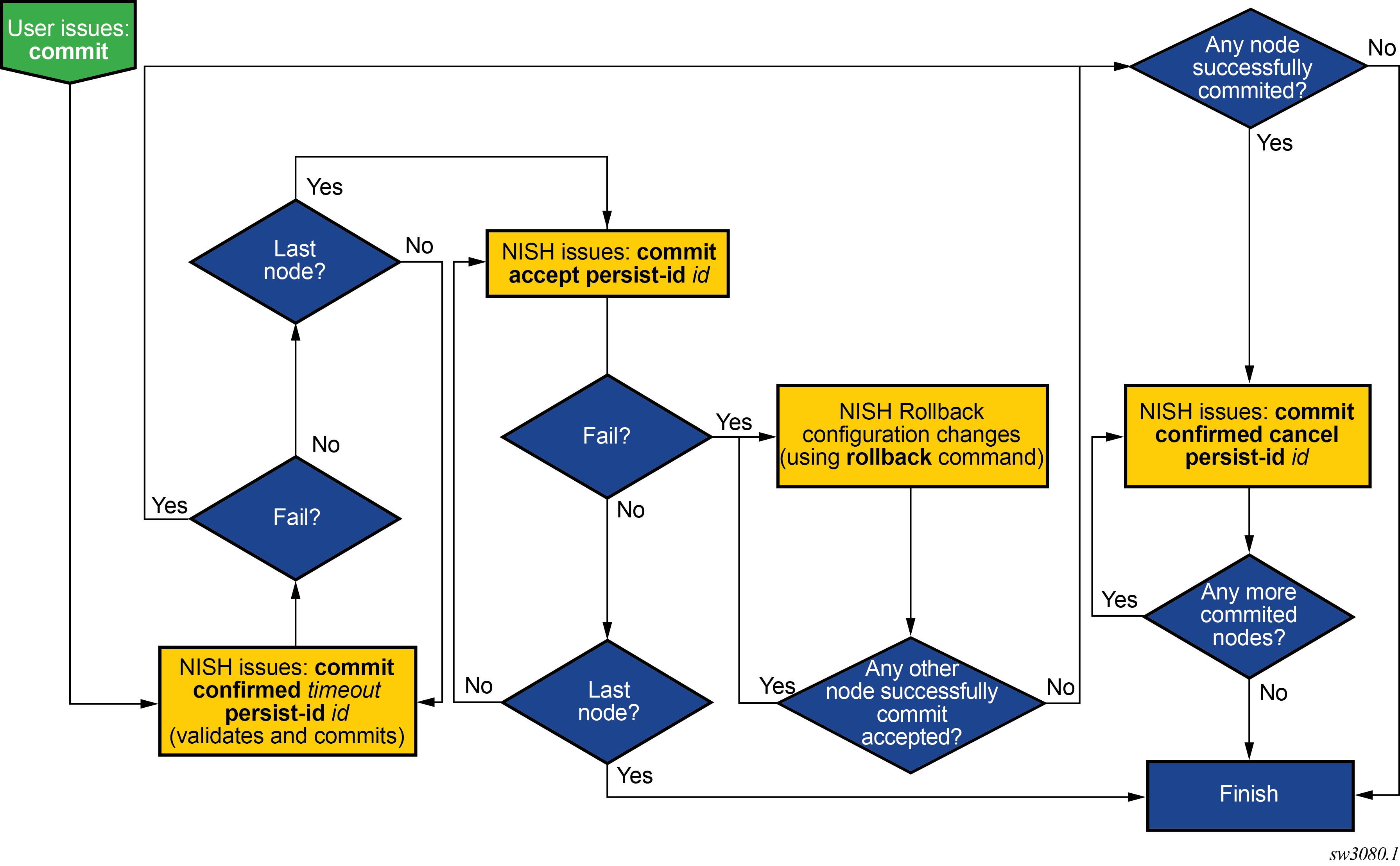To commit a configuration change in a multinode group, every node in the group must have automatic saving of configuration changes enabled in the MD-CLI. This is enabled by configuring the auto-config-save command in the configure system management-interface cli md-cli context on each device and committing this configuration change. The multinode commit process driven from the NISH client uses standard MD-CLI features to achieve the atomic commit. The two phases in the multinode commit operation are as follows: