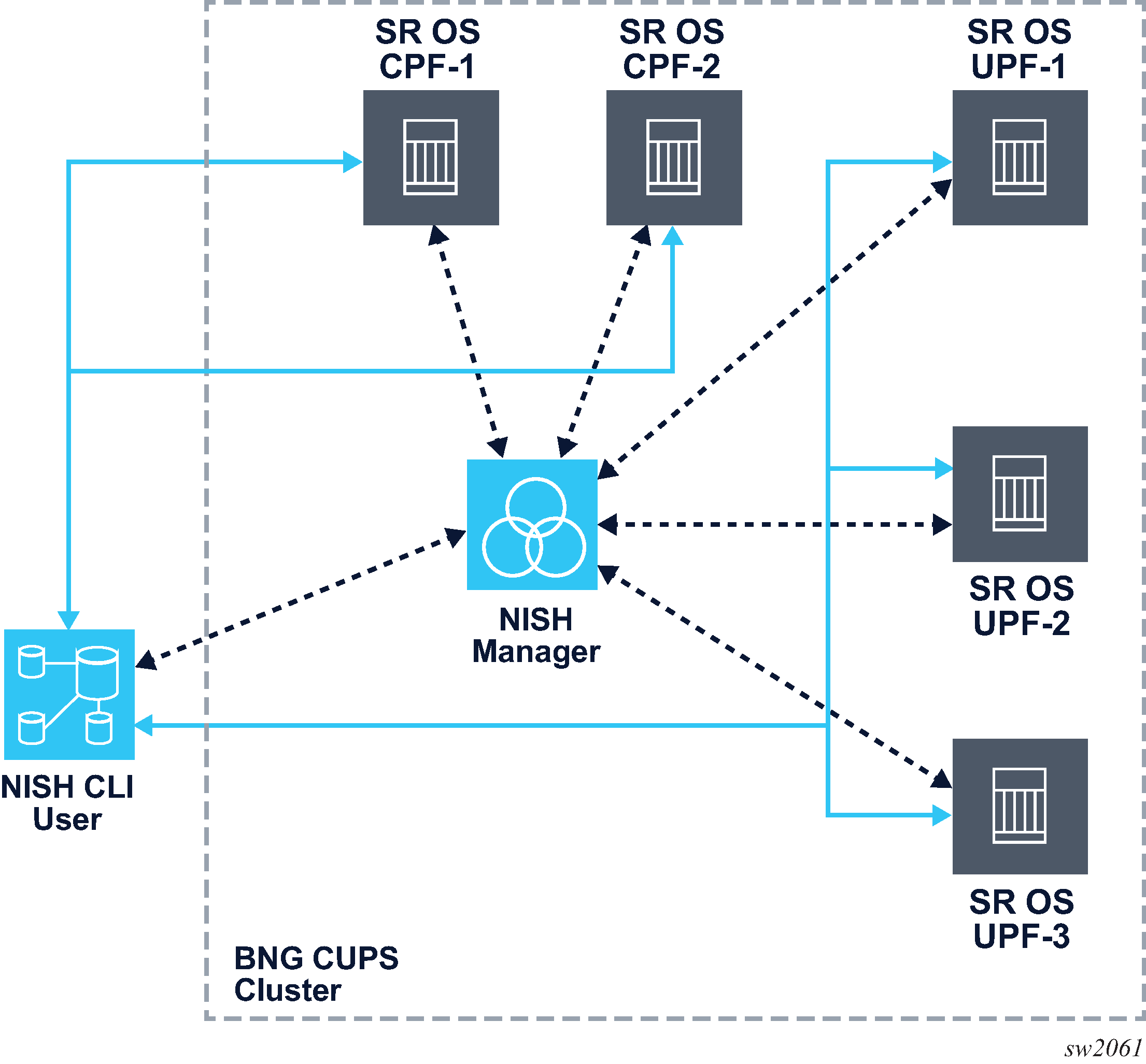 The NISH manager does not make any outbound connections to the SR OS nodes or to the NISH client, although it does respond to both.